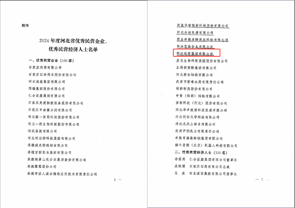 4月23日,河北省人民政府下發(fā)《關(guān)于表彰2024年度河北省優(yōu)秀民營(yíng)企業(yè)、優(yōu)秀民營(yíng)經(jīng)濟(jì)人士的通報(bào)》,決定表彰100家優(yōu)秀民營(yíng)企業(yè)和110名優(yōu)秀民營(yíng)經(jīng)濟(jì)人士。明達(dá)線纜集團(tuán)有限公司被授予“2024年度河北省優(yōu)秀民營(yíng)企業(yè)”稱號(hào),榮獲通報(bào)表彰。